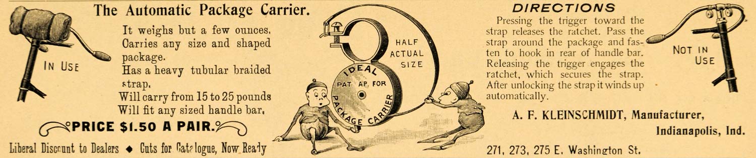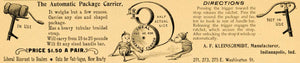 This is a tiny original 1896 black and white print ad for the automatic package carrier from A. F. Kleinschmidt of Indianapolis, Indiana.