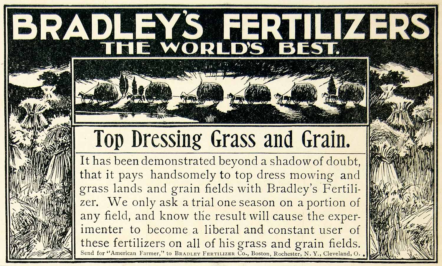 This is an original 1896 black and white print ad for the top dressing grass and grain manures that were made by the Bradley Fertilizer Company.