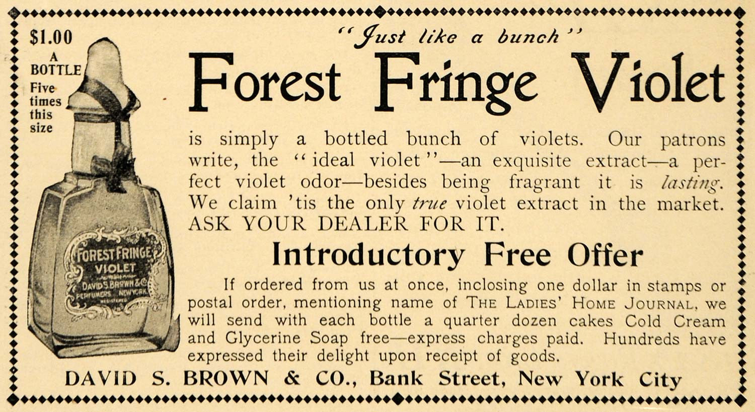 This is a small original 1896 black and white print ad for the perfume Forest Fringe Violet from David S. Brown and Company of New York City.