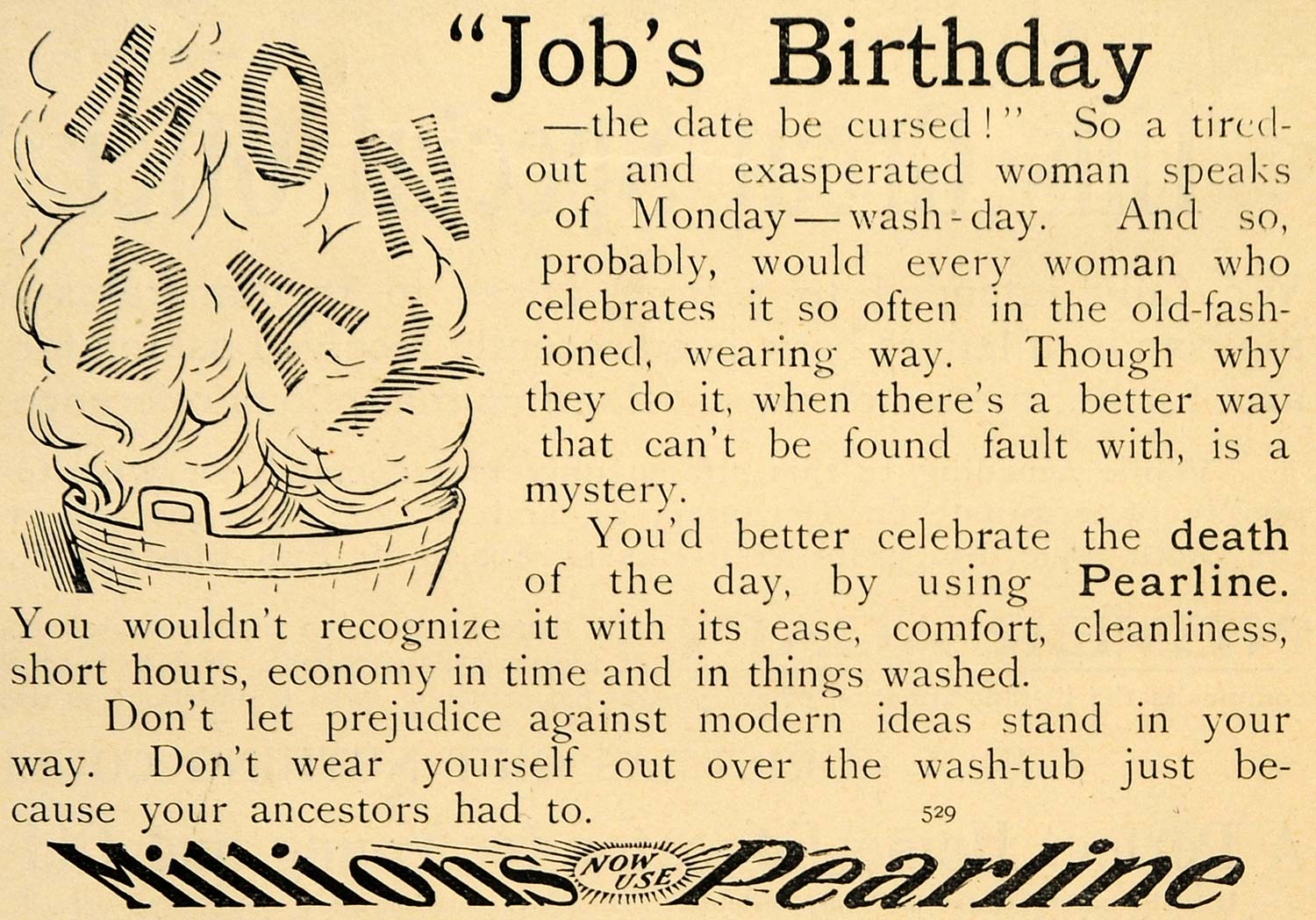 This is an original 1896 black and white print ad for Pearline. The ad writes, "Don't let prejudice against modern ideas stand in your way. Don't wear yourself out over the wash-tub just because your ancestors had to".