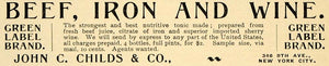This is a tiny original 1896 black and white print ad for the Beef, Iron and Wine, a nutrituis beverage from John C. Childs and Company located at 346 8th Avenue, New York.