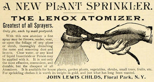 This is a small original 1896 black and white print ad for the Lenox Atomizer sprayers from John Lewis Childs located in Floral Park, New York.
