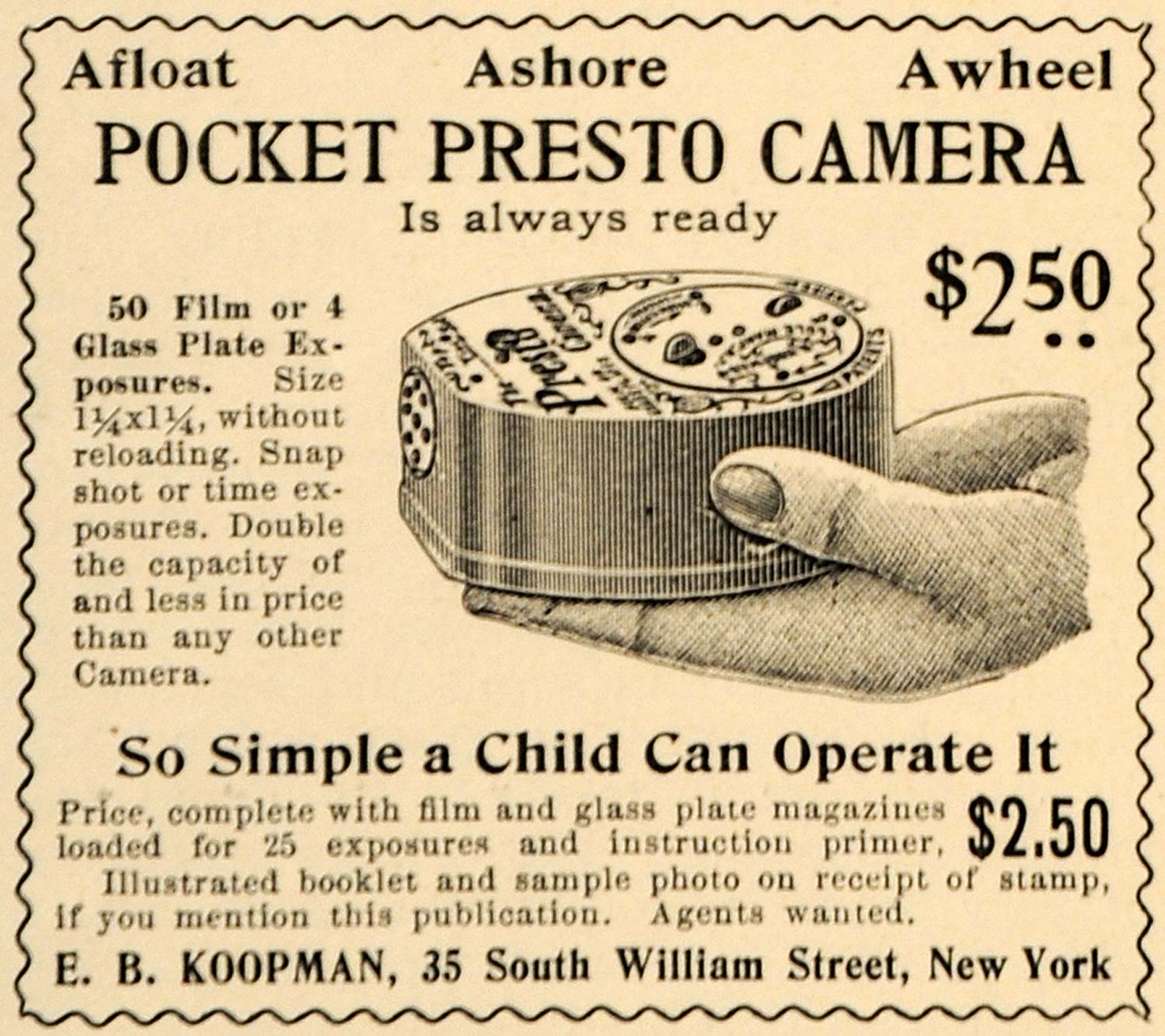 This is a small original 1896 black and white print ad for the Pocket Presto Camera from E. B. Koopman of New York. The ad writes, "So simple a child can operate it."