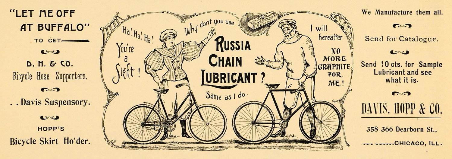 This is a small original 1896 black and white print ad for the Russia Chain Lubricant from Davis, Hopp and Company of Chicago, Illinois.