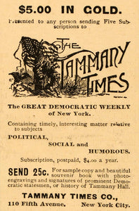 This is an original 1896 black and white print ad for The Tammany Times political publication. The address in the ad, 110 Fifth (5th) Ave, is an office building in the Flatiron District which was built as an office building for publishing houses and was later acquired by the New York Times.