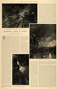 This is an original 1896 2 page (1 page, double-sided) article by John Gilmore Speed on the challenges, as well as insight on conducting a nighttime train. This article includes illustrations by W. Louis Sonntag Jr.