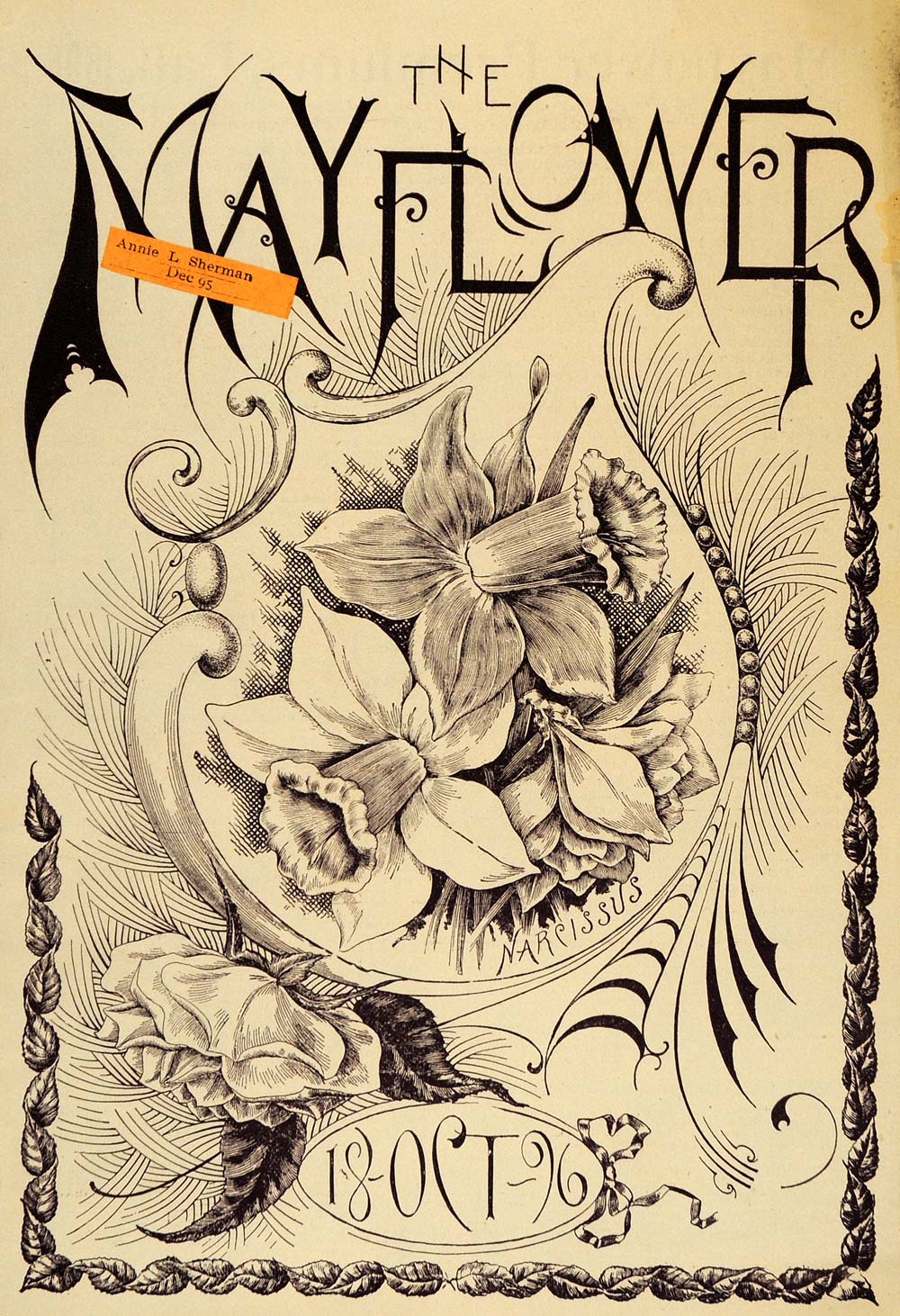 This is an original 1896 color cover for the October 1896 issue of The Mayflower, featuring an image of a garden of daffodils. Please note that there is an orange sticker on the issue with the name "Annie L Sherman".CONDITION