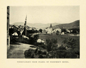 This is an original 1896 black and white halftone print of a Vossevangen, as viewed from the piazza of Fleicher's Hotel in Norway.