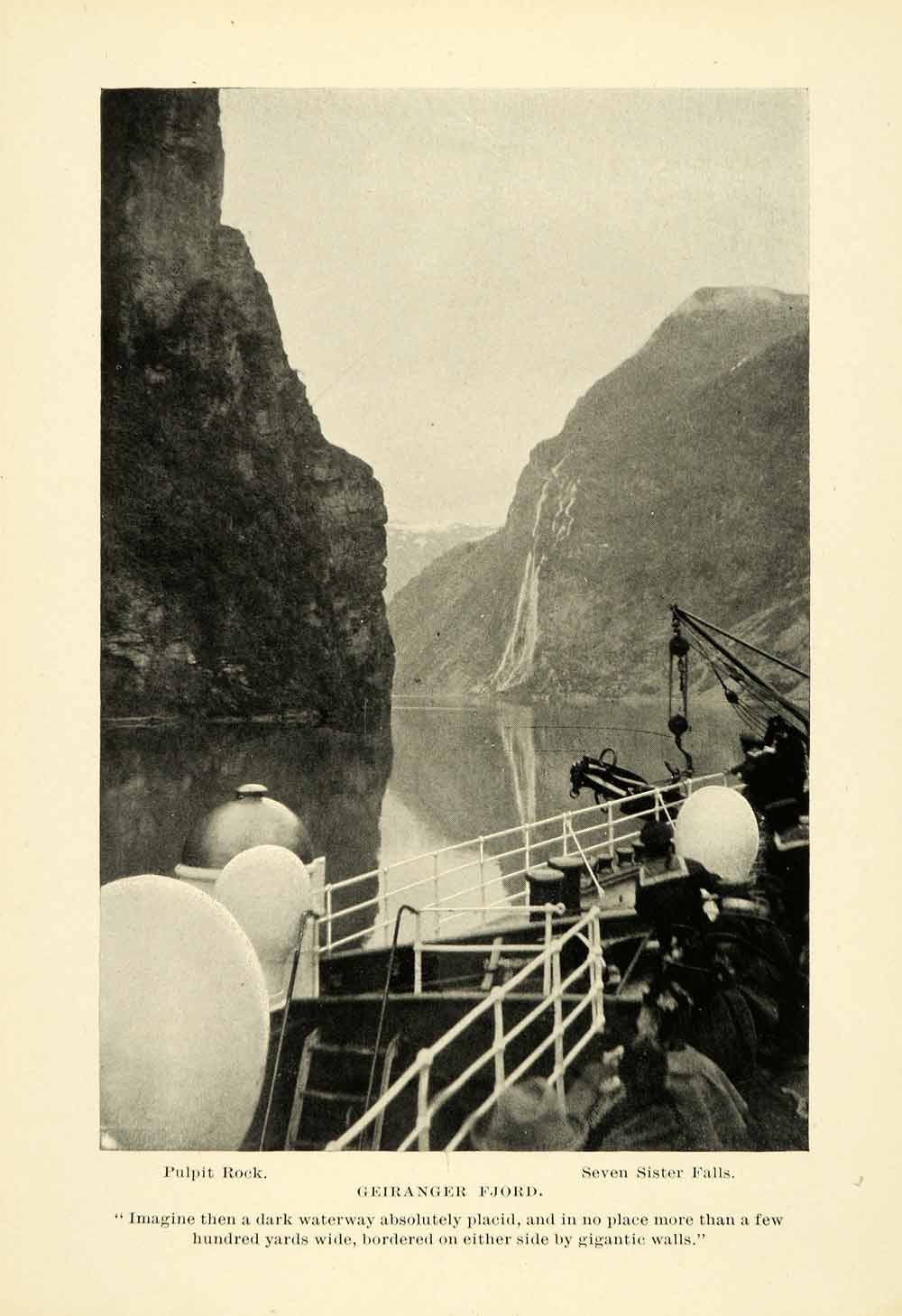 This is an original 1896 black and white halftone print of the Geirangerfjord, Pulpit Rock and Seven Sister Waterfall in Norway.