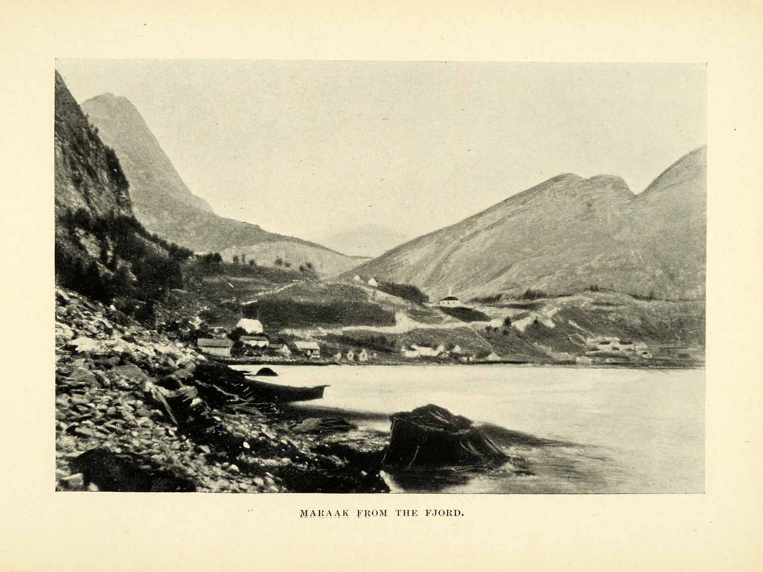 This is an original 1896 black and white halftone print of Maraak in Norway as viewed from the Fjord.