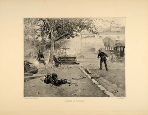 This is an original 1896 halftone print of a painting by artist, M. Boutigny. The image displays a sneak ambush on a city. The actual image measures 10 x 7.75 inches. On the reverse is a short interpretation of the painting.