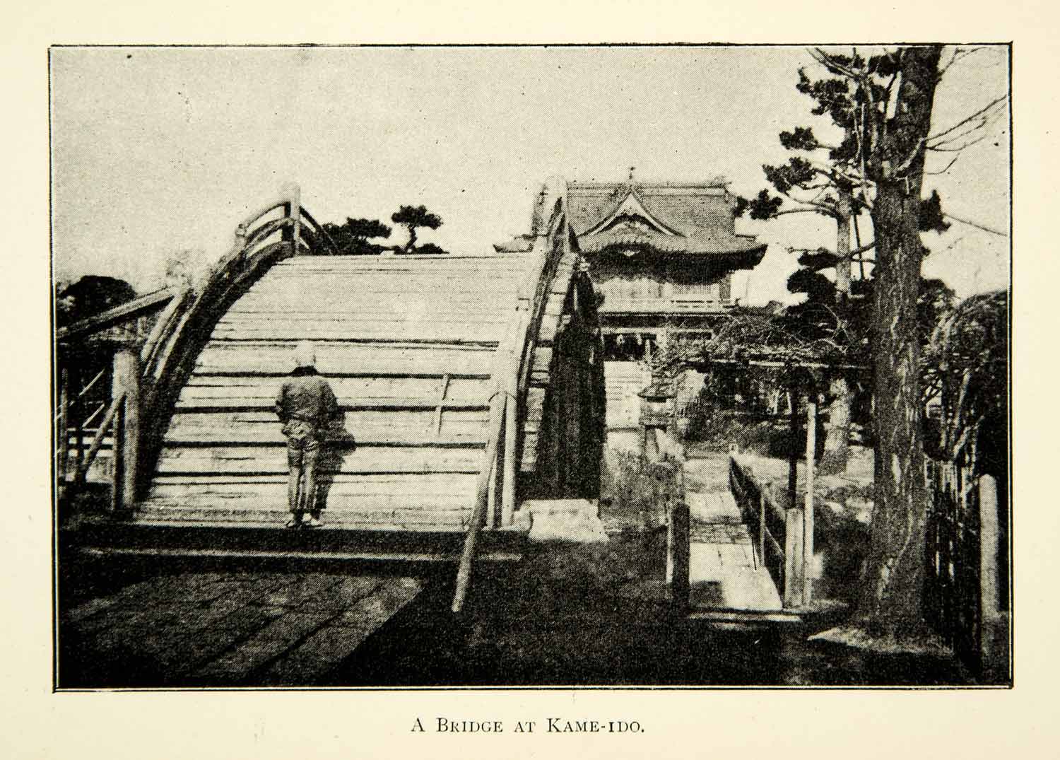 This is an original 1896 black and white halftone print of a fairly steep bridge in Kameido, Japan.