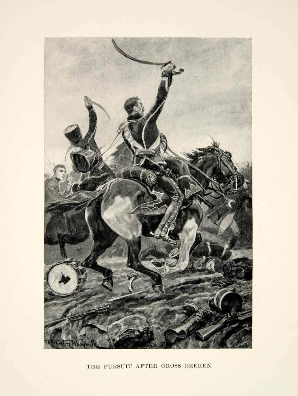 This is an original 1896 black and white halftone print of Prussian cavalry counter attacking a failed French assault during the battle of Gro§eeren. After a 7 week truce in the War of the Sixth Coalition, Napoleon launched an attack against the Prussian capital of Berlin, hoping to force Prussia out of the war. His attack was bogged down by heavy rain, swampy terrain, and poor officers.