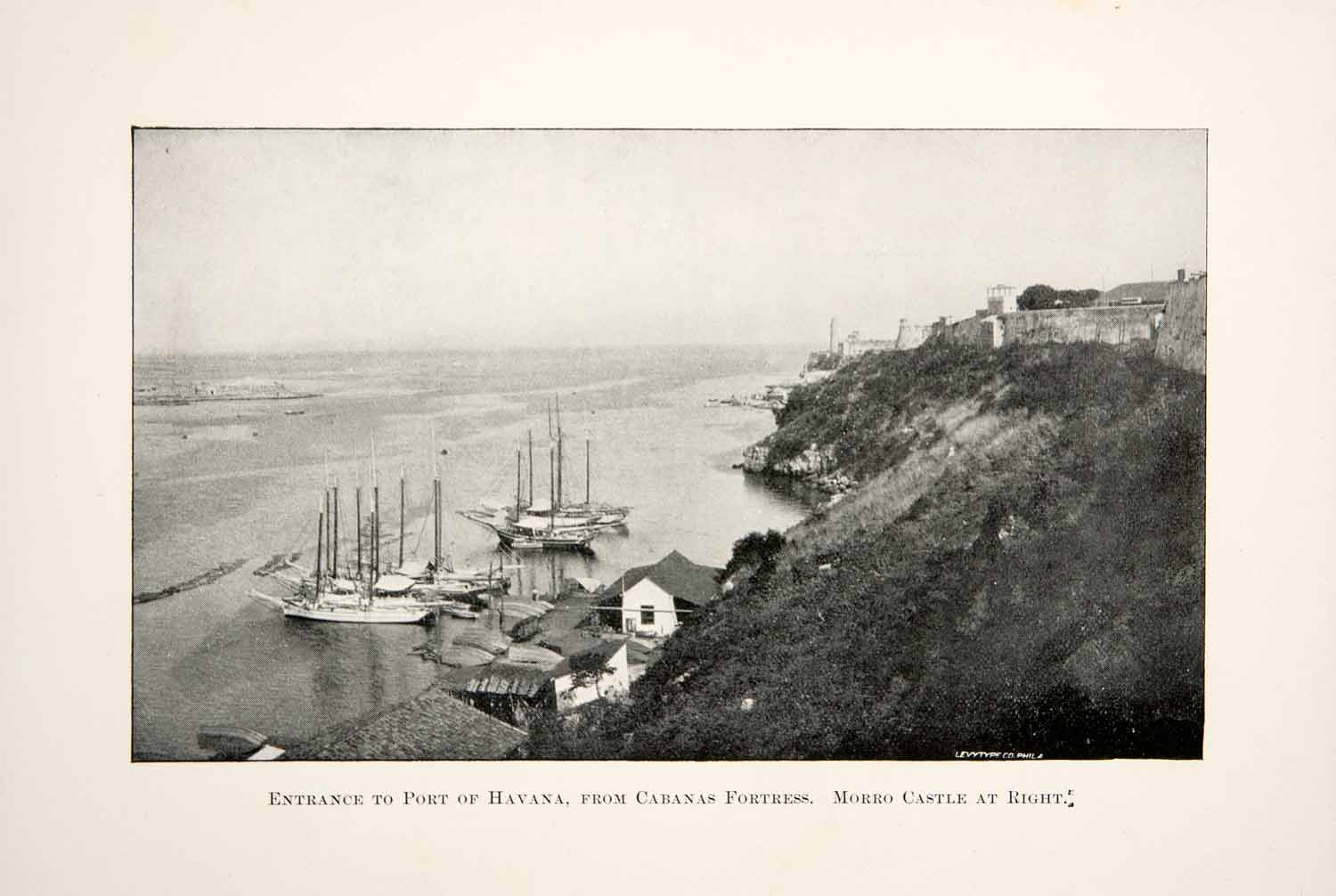This is an original 1896 black and white halftone print of "Entrance to Port of Havana, From Cabanas Fortress. Morro Castle at Right." This late nineteenth century image captures the entrance to the Port of Havana and Morro Castle, a picturesque fortress overlooking the entrance. The Castle was built in 1589 based upon the design of Juan Bautista Antonelli, an Italian engineer.