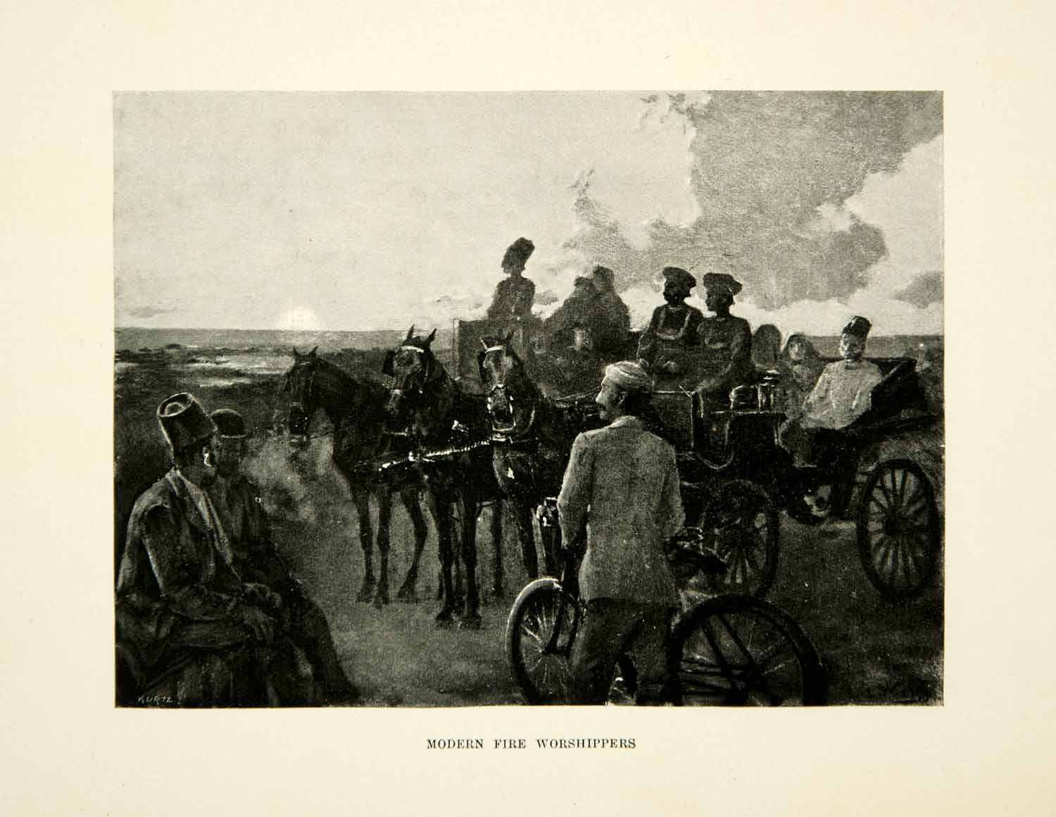 This is an original 1896 black and white in-text wood engraving of fire worshippers being met by an English exploring party in India.