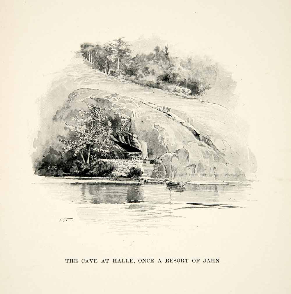This is an original 1896 black and white halftone print of a cave near the town of Halle which had once been a resort and study area of Friedrich Ludwig Jahn, the German nationalist and soldier.