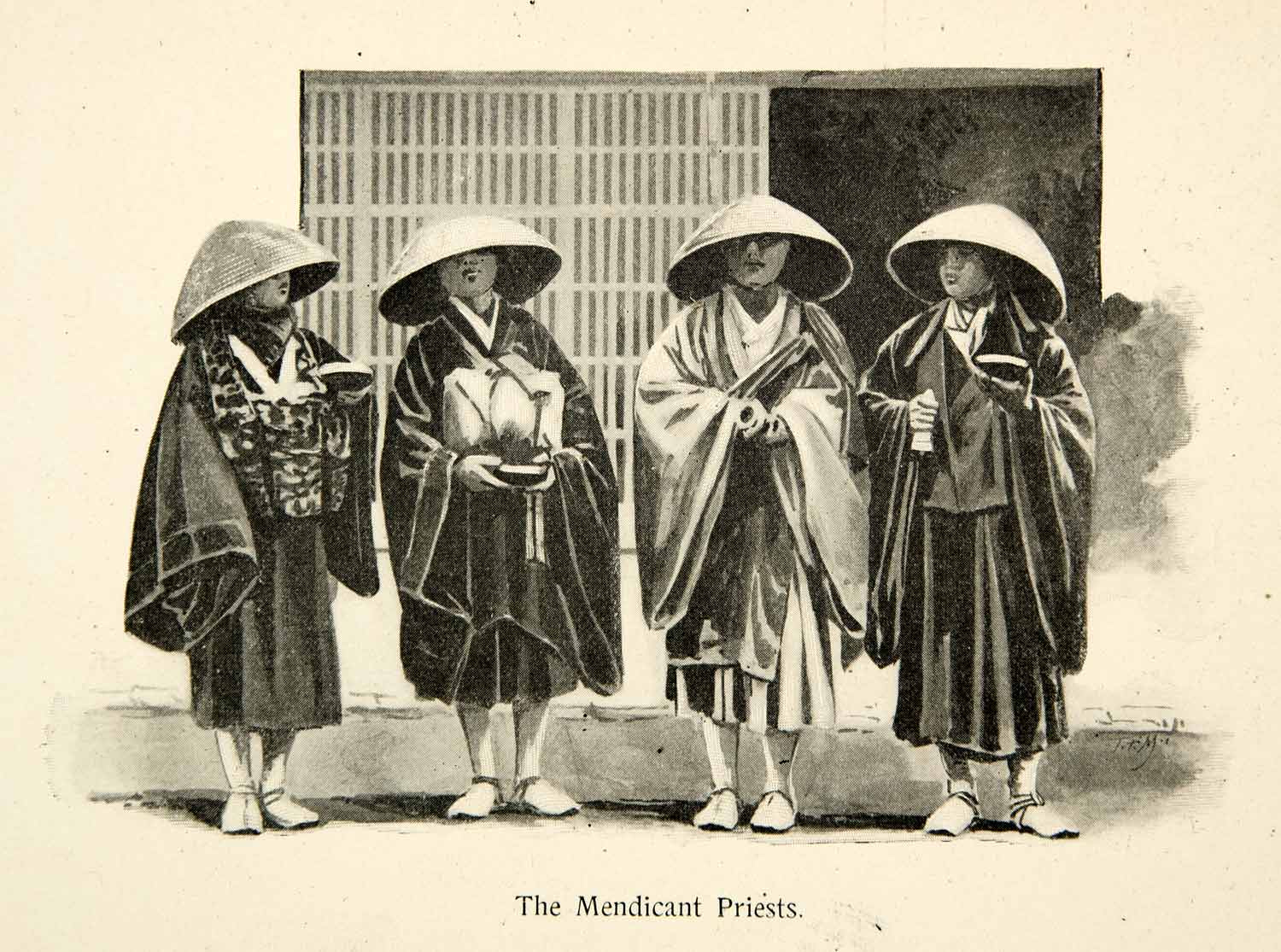 This is an original 1896 monochrome halftone print depicting a scene of Mendicant Priests in Japan.