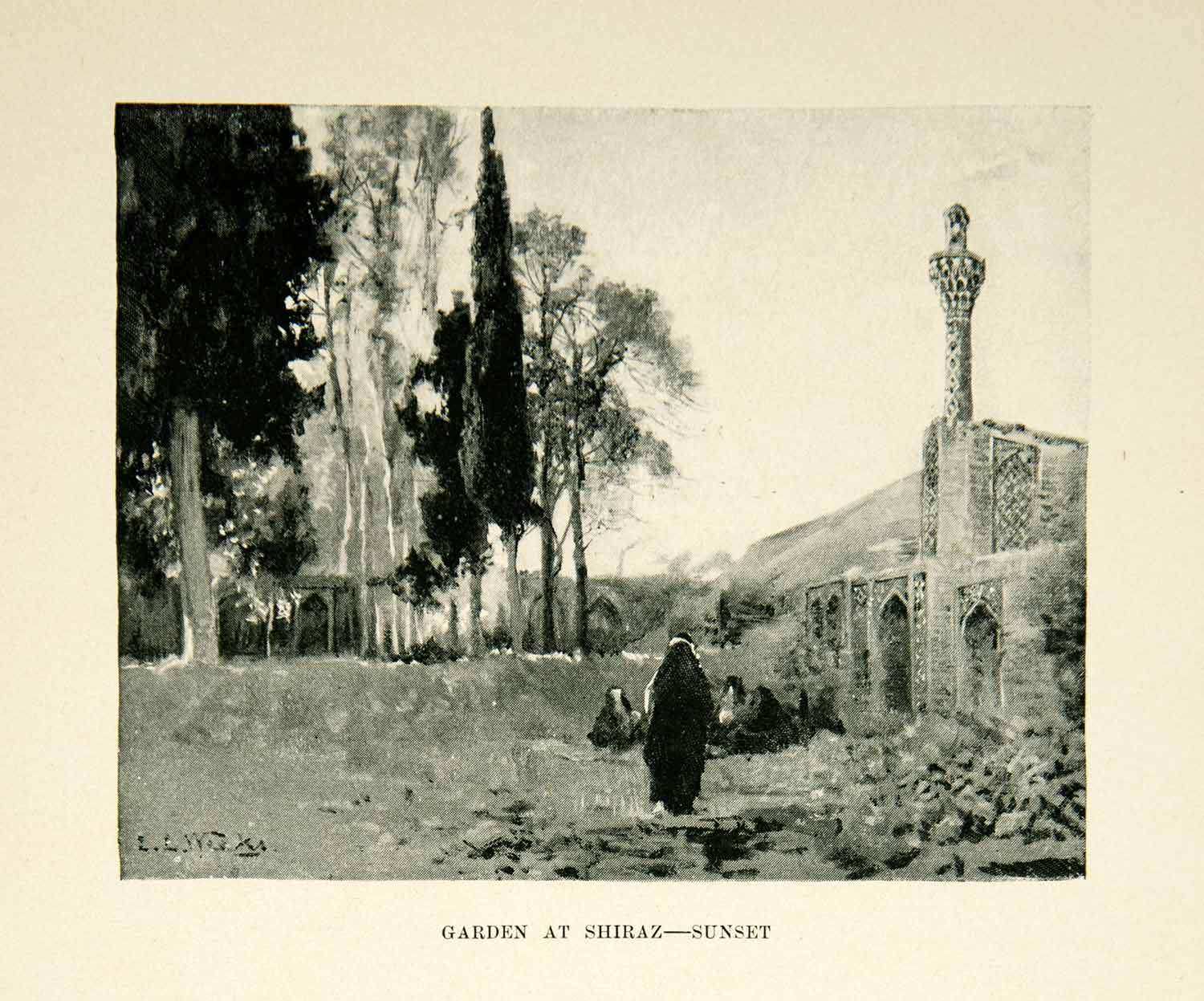 This is an original 1896 black and white in-text wood engraving of the Garden at Shiraz in Iran at Sunset.