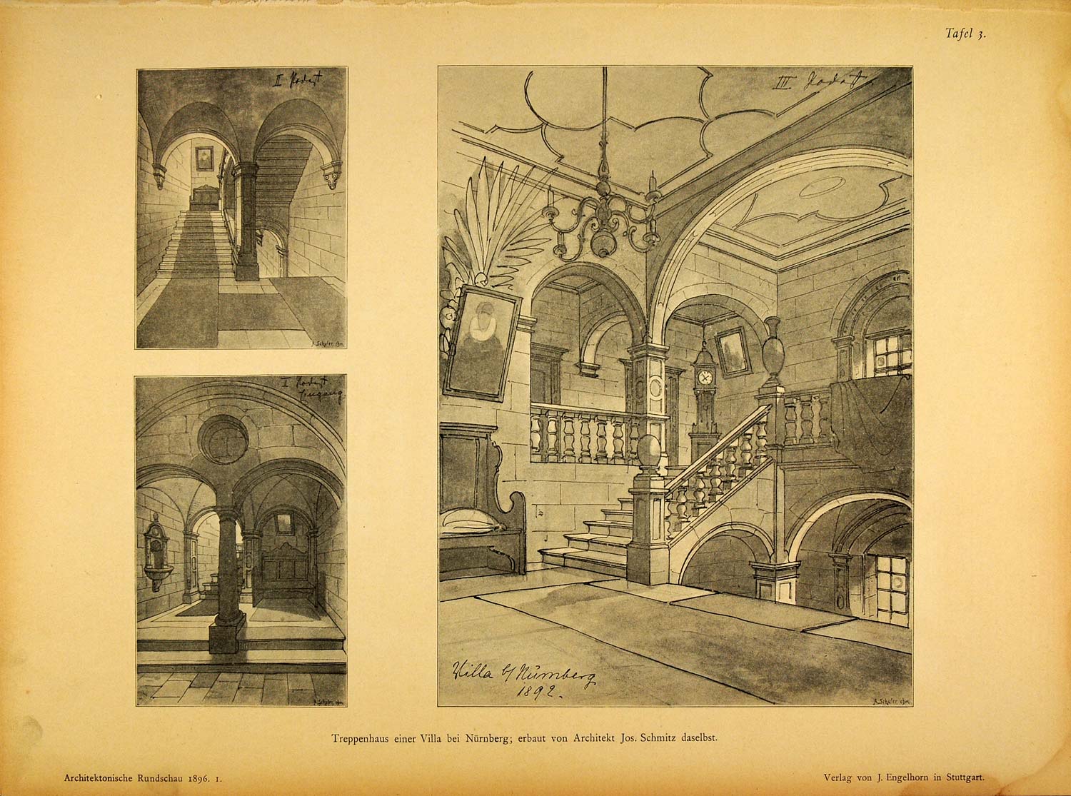 This is an original 1896 halftone print of an architectural drawing of a staircase in a mansion near Nuremberg, Germany. Architect: Jos. Schmitz.