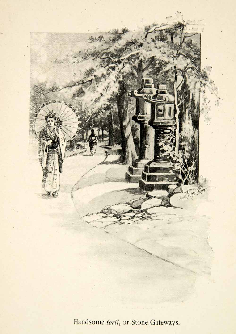 This is an original 1896 monochrome halftone print of a scene depicting a torii, or stone gateway, in Japan.
