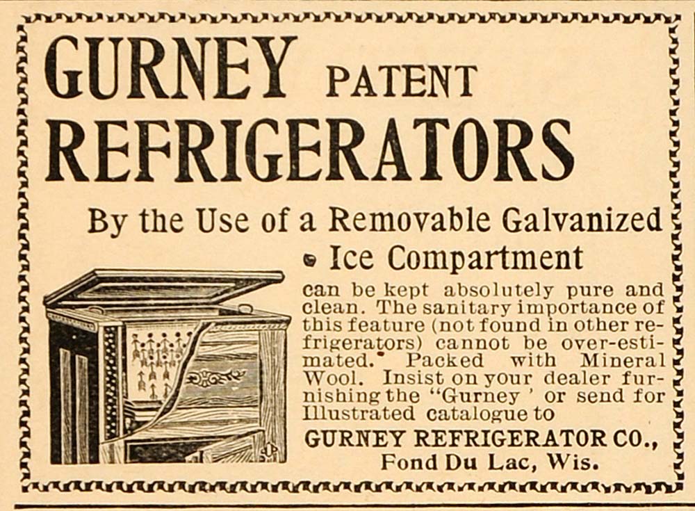 This is an original 1896 black and white print ad for Gurney Patent Refrigerators from the Gurney Refrigerator Co. of Fond du Lac, Wisconsin.