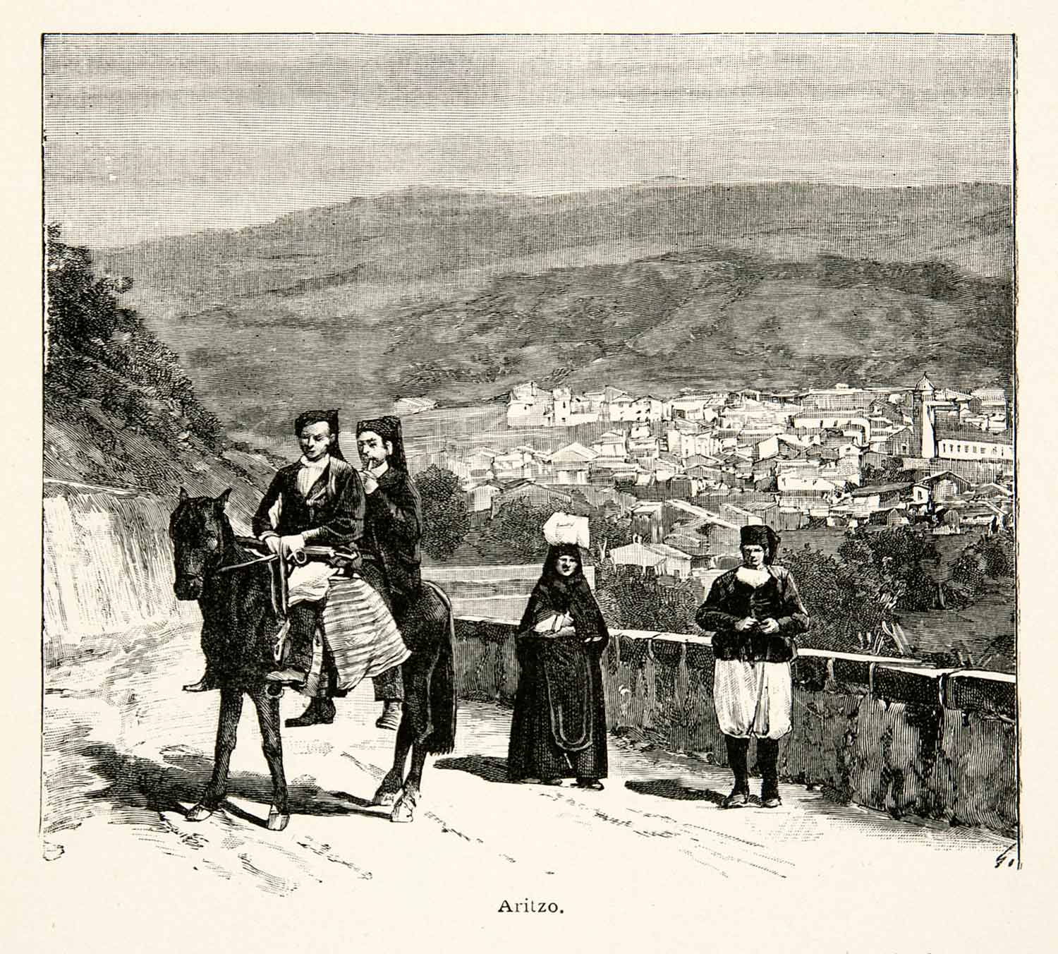This is an original 1896 black and white in-text wood engraving which depicts a small group of Sardinians on their way to Aritzo, laid out behind them in the distance CONDITION