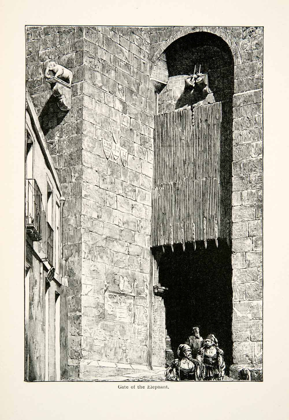 This is an original 1896 black and white wood engraving of the famous Elephant Gate located in Cagliari, Sardinia. It gets its name from the elephant sculpture adjacent to the spiked portcullis.