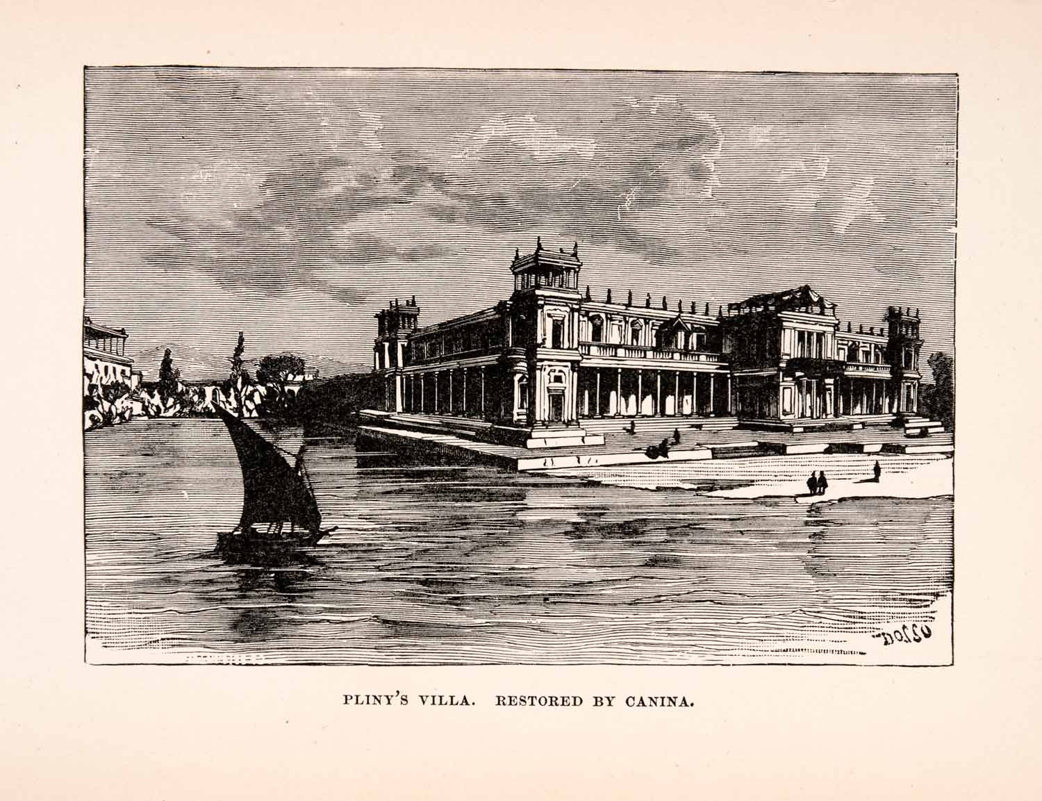 This is an original 1896 black and white in-text wood engraving of "Pliny's Ville. Restored by Canina."