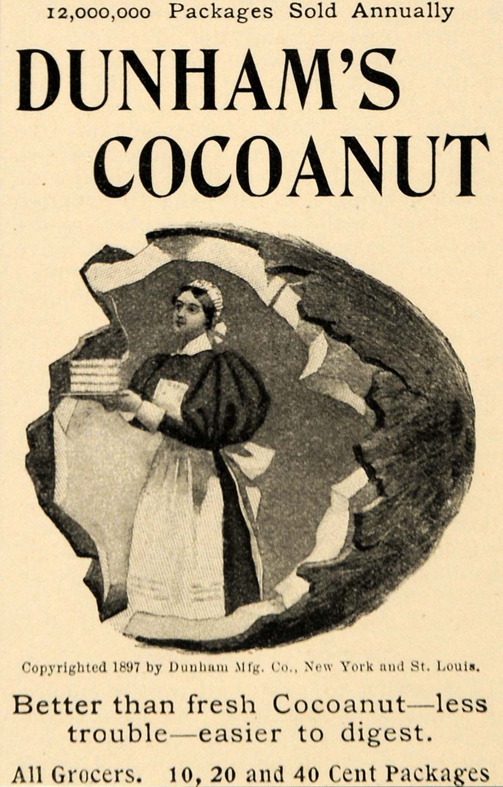 This is a small original 1897 black and white print ad for Dunham's Cocoanut.