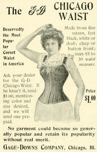 This is a small original 1897 black and white print ad for the Gage-Downs Company of Chicago, Illinois. This ad features their G-D Chicago Waist Corsets for women.