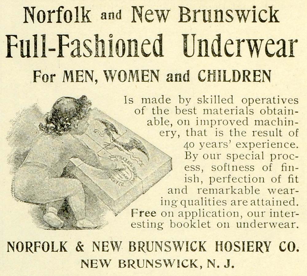 This is a small original 1897 black and white print ad for the Norfolk & New Brunswick Hosiery Company of New Brunswick, New Jersey. This ad is for their Full-Fashioned Underwear for men, women, and children.