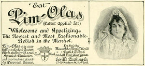 This is a small original 1897 black and white print ad for Pim-Olas relish, a product line by Seville Packing Company, located at 77-79 Hudson Street in New York. This product was distributed by Park and Tilford, as well as Acker, Merrall and Condit.