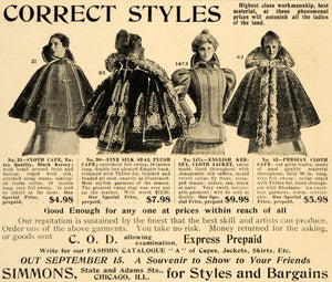 This is an original 1897 black and white print ad for Simmons Correct Styles Fashion capes and jackets.