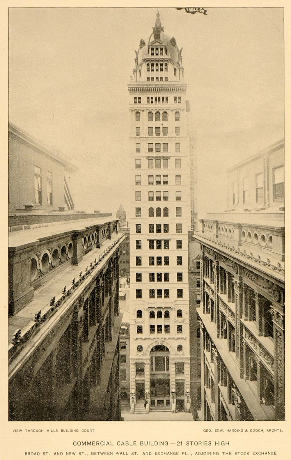This is an original 1897 halftone print of the 21-story Commercial Cable Building, Broad Street and New Street, in New York City. (Please note that, as is typical of halftone prints, there is printing on the reverse.)