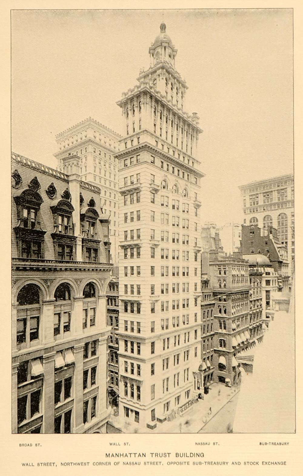 This is an original 1897 halftone print of the Manhattan Trust Building, Wall Street, northwest corner of Nassau Street, in New York City. (Please note that, as is typical of halftone prints, there is printing on the reverse.)