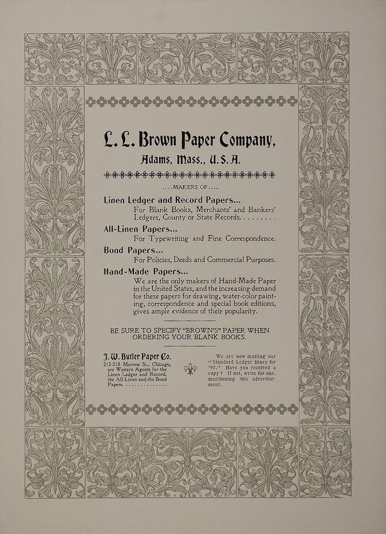 This is an original 1897 black and white print ad for the L. L. Brown Paper Company, Adams, Massachusetts. J. W. Butler Paper Company, Chicago, Western Agents. Very nice border decoration!