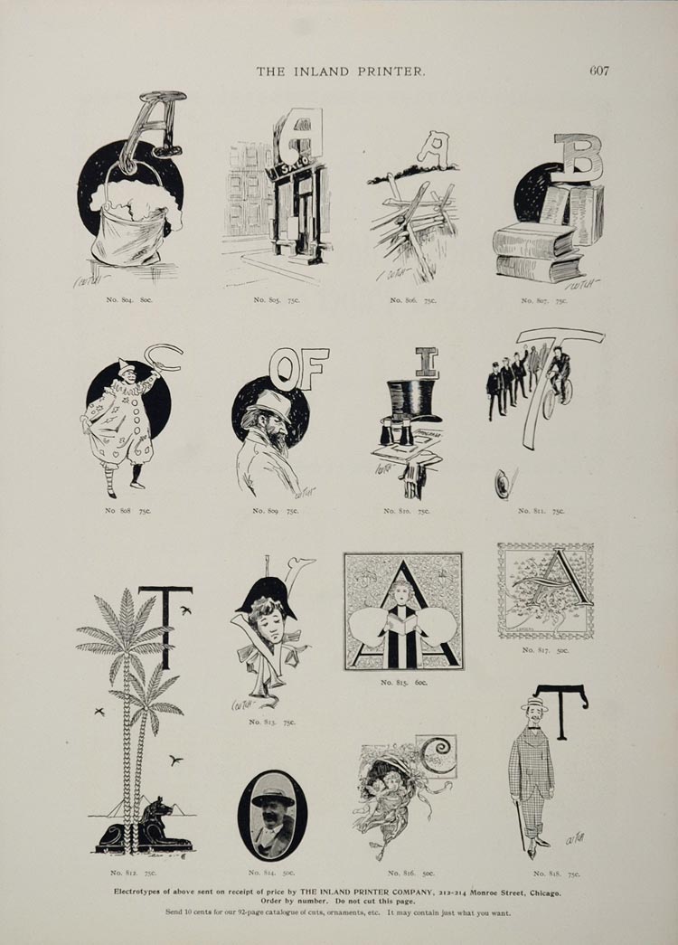 This is an original 1897 black and white print ad for ornamental type designs and letter fonts available from The Inland Printer Company, Chicago. This is an unusual piece that would be of interest to a collector of vintage printing and typesetting.