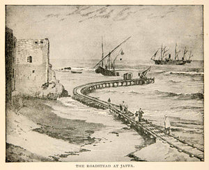 This is an original 1897 black and white halftone print of the winding quay at Jaffa. Now part of Tel Aviv, the important Mediterranean port city is well-known for its association with the biblical figure Jonah, as it also went by the name Joppa.