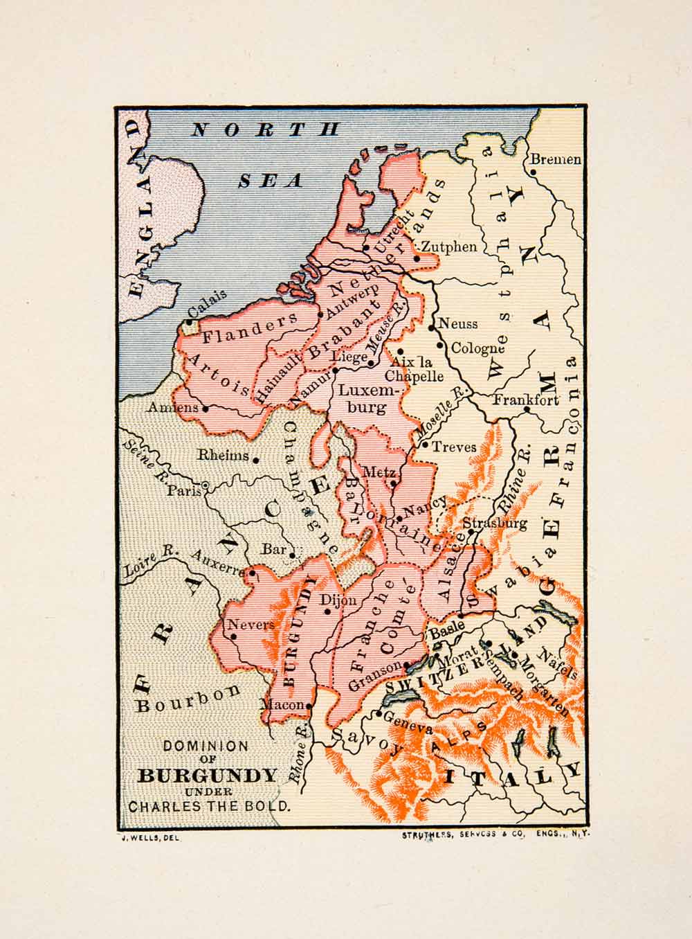 Keywords specific to this image: Netherlands, Flanders, Braband, Luxembourg, Alsace, Swabia, Franconia, Bourbon, Amiens, Calais, Zutphen, Utrecht, Rheims, Geneva, Strasburg, Treves, Cartography