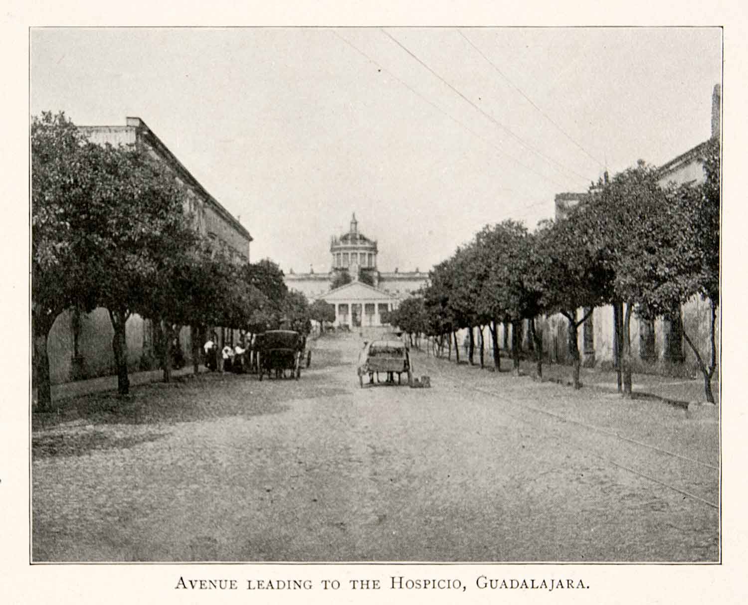 This is an original 1897 black and white halftone print of the "Avenue Leading to the Hospicio, Guadalajara," in Mexico.