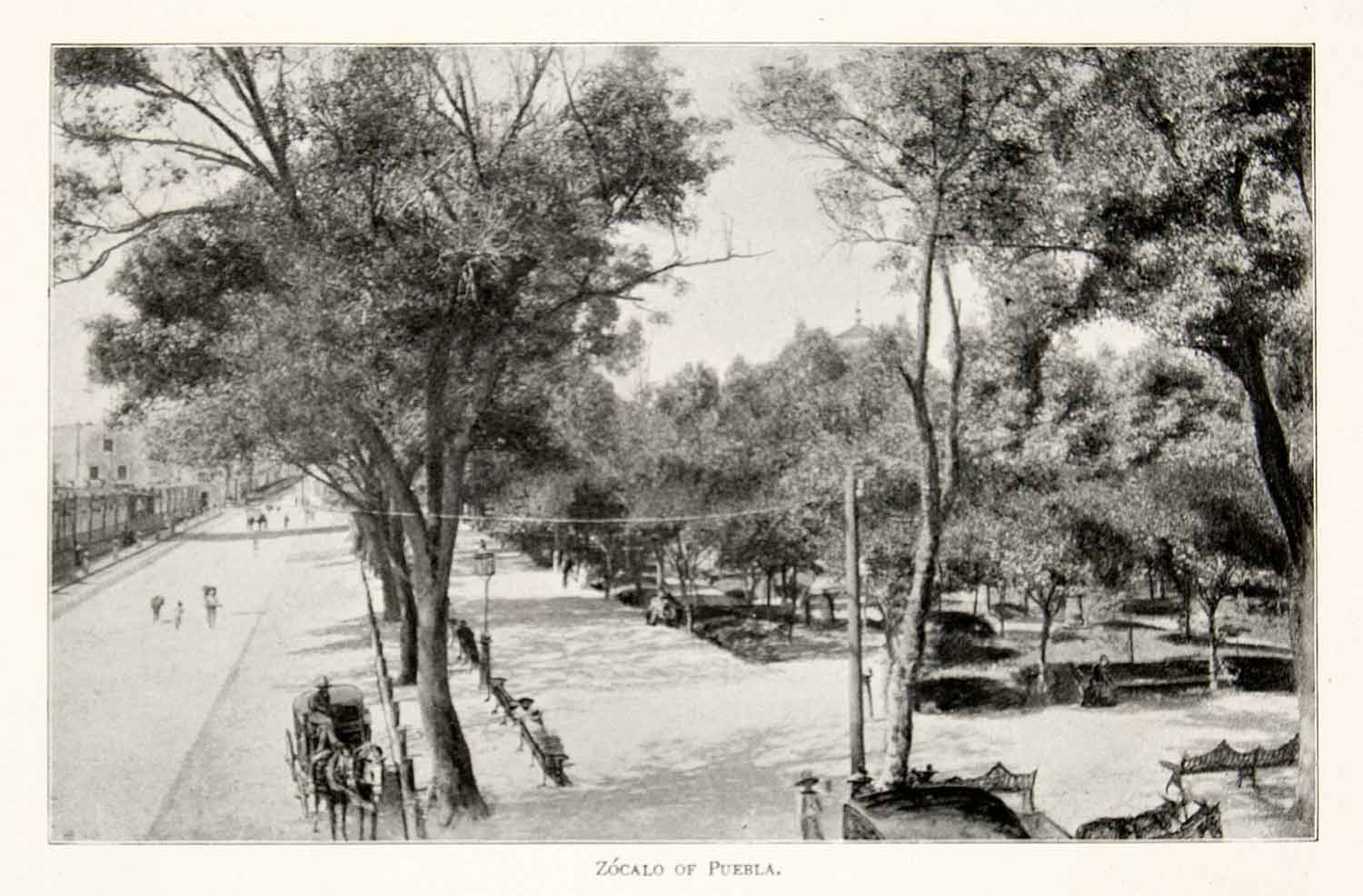 This is an original 1897 black and white halftone print of the "Zocalo of Puebla," in Mexico.