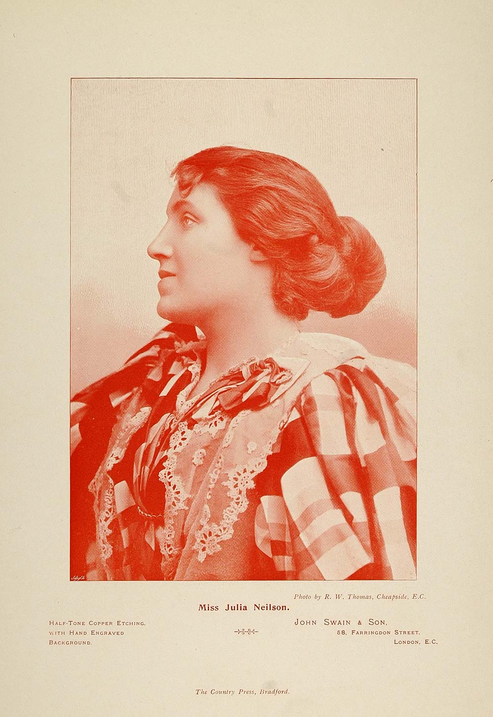 This is an original 1897 halftone print portrait of Julia Neilson, an English stage actress, from a photograph by R. W. Thomas. Halftone copper etching with hand engraved background. John Swain & Son. (Please note that the outer border is white not blue.)