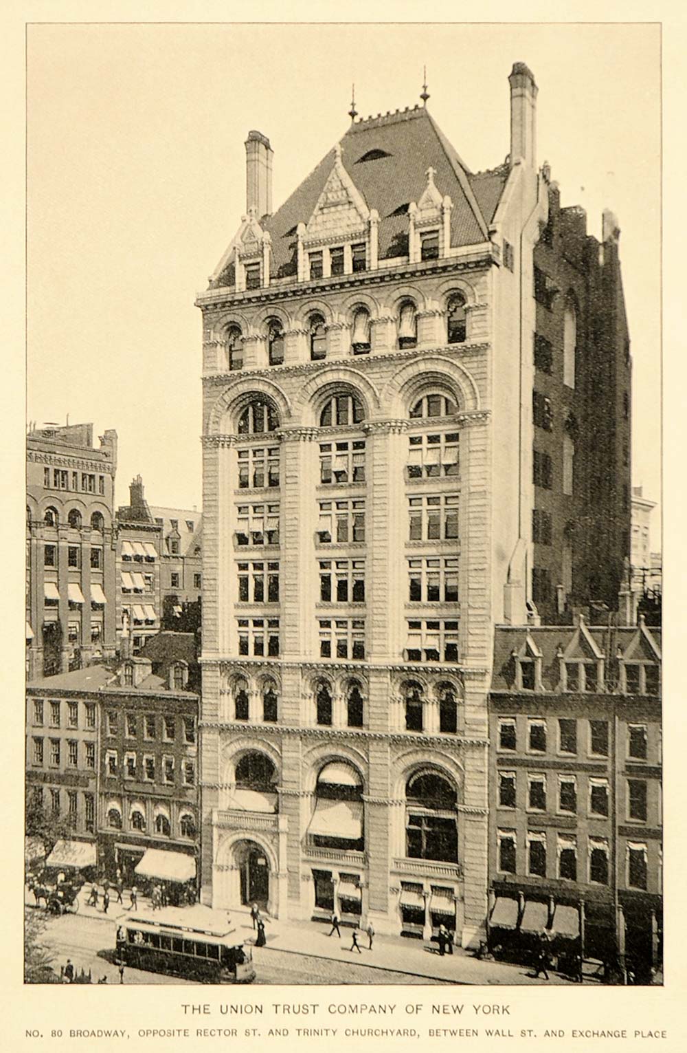 This is an original 1897 halftone print of the Union Trust Company of New York, no. 80 Broadway, between Wall Street and Exchange Place, in New York City. (Please note that, as is typical of halftone prints, there is printing on the reverse.)