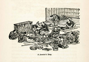 This is an original 1897 black and white in-text wood engraving of a Meiji Period jeweler's shop in Tokyo, Japan.