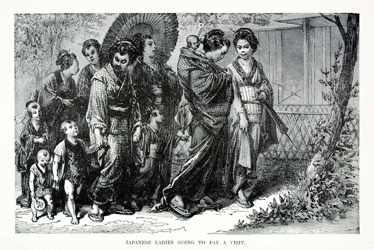 This is an original 1897 black and white wood engraving of Japanese women gathering with their children "to pay a visit" in Yokohama.