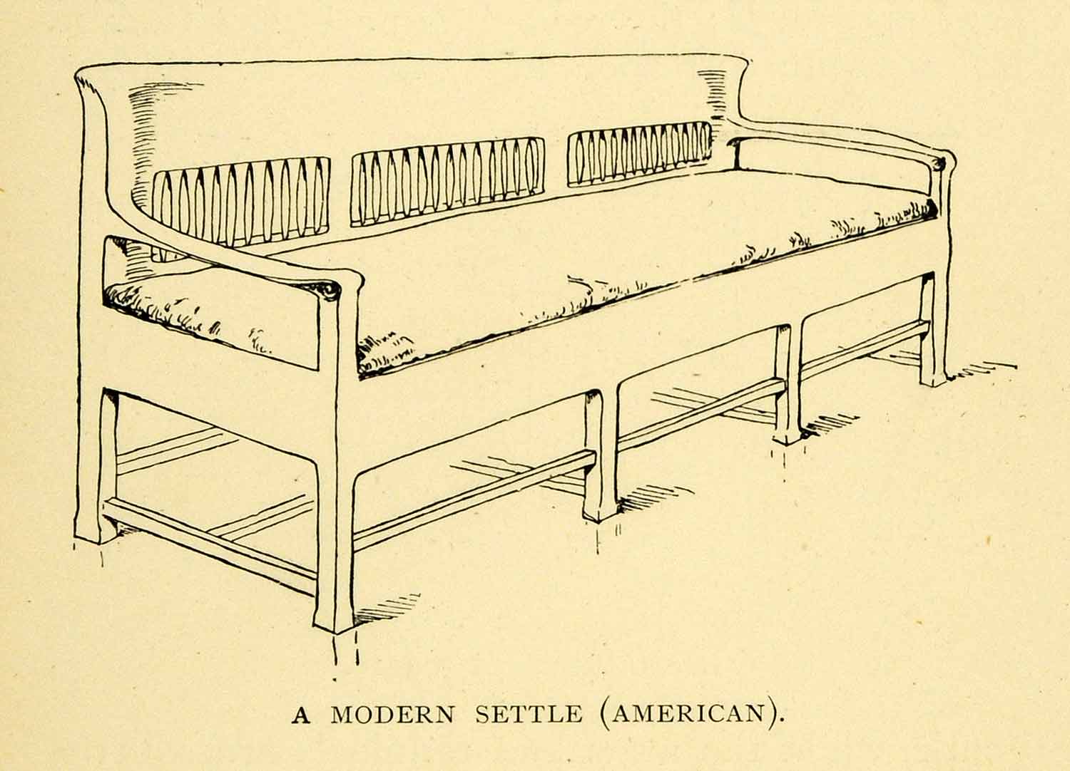 This is an original 1897 black and white wood engraving of a "Modern Settle (American)."