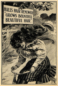 This is an original 1898 black and white print ad for Hall's Hair Renewer, "Grows Bountiful Beautiful Hair." This ad has an illustration done by Binner.
