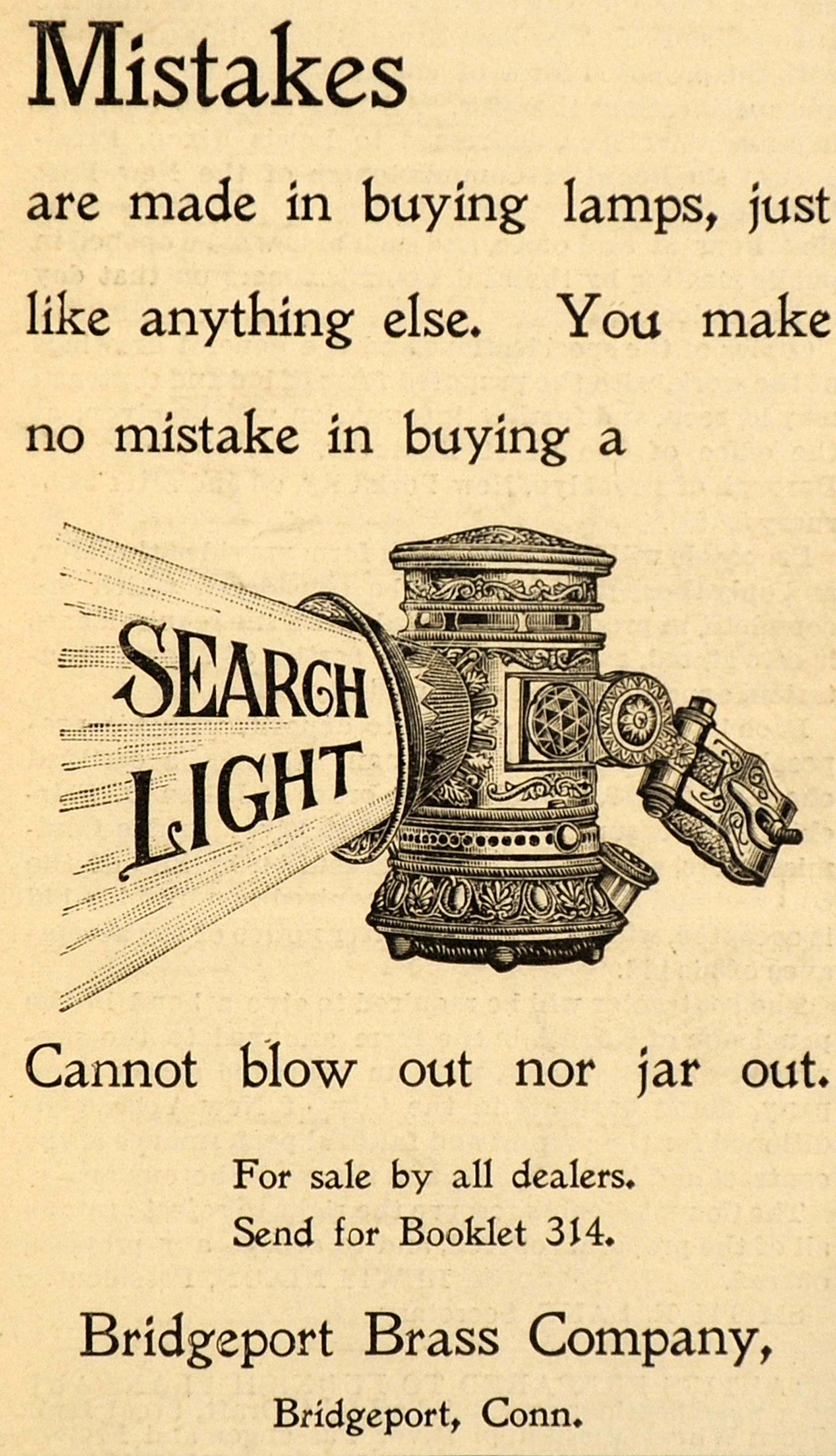 This is a small original 1898 black and white print ad for lamps from Bridgeport Brass Company located in Bridgeport, Connecticut.