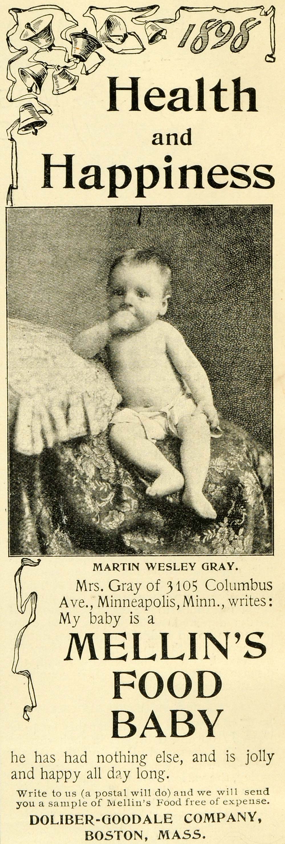 Mellin's Baby Food. Considering the difficulties some mothers had with breast-feeding, the fact that some infants could not properly digest fresh cowÕs milk, the time consuming burden of preparing and producing homemade baby food, as well as sanitation concerns surrounding infant mortality due to infected or sour milk, G. Mellin of London decided to join the few other companies that produced food for infants. However, unlike the others, Mellin created a food for babies and infants that needed very little preparation. MellinÕs Food was already boiled and strained and only needed a small amount of hot water and milk before it could be consumed. Theodore Metcalf & Company, located at 39 Tremont Street in Boston, Massachusetts, became the primary British and United States agents for MellinÕs Food. Between 1884 and 1906, Doliber-Goodale Company, located at 41 Central Wharf in Boston, Massachusetts, joined as an additional selling agent for MellinÕs Food.