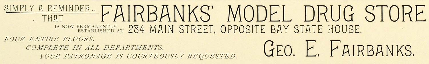 This is a tiny original 1898 black and white print ad for the Fairbank's Model Drug Store located at 284 Main Street, Worcester, Massachusetts.